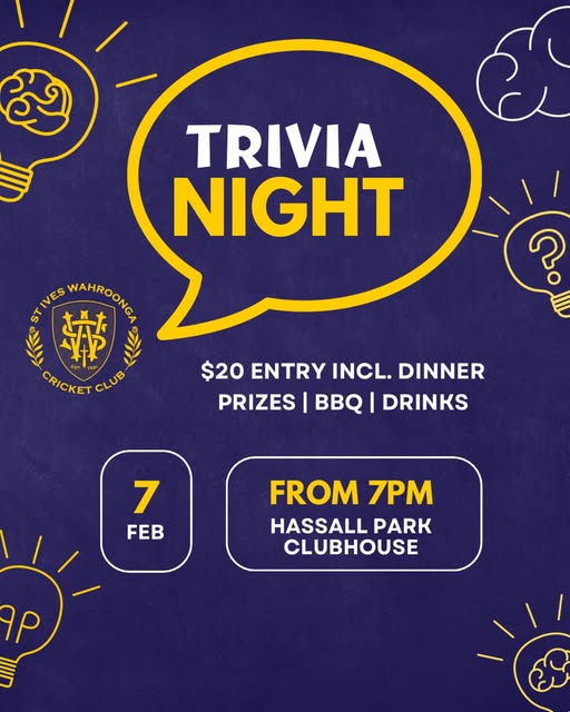 News TRIVIA NIGHT SAT 7 FEB By stivescc - January 19, 2026 0 7 Share on Facebook Tweet on Twitter Friends and family are invited for an evening of all age trivia with dinner included. Prizes, special games, raffles and much more… $20 Entry. Incl. Dinner Facebook Comments